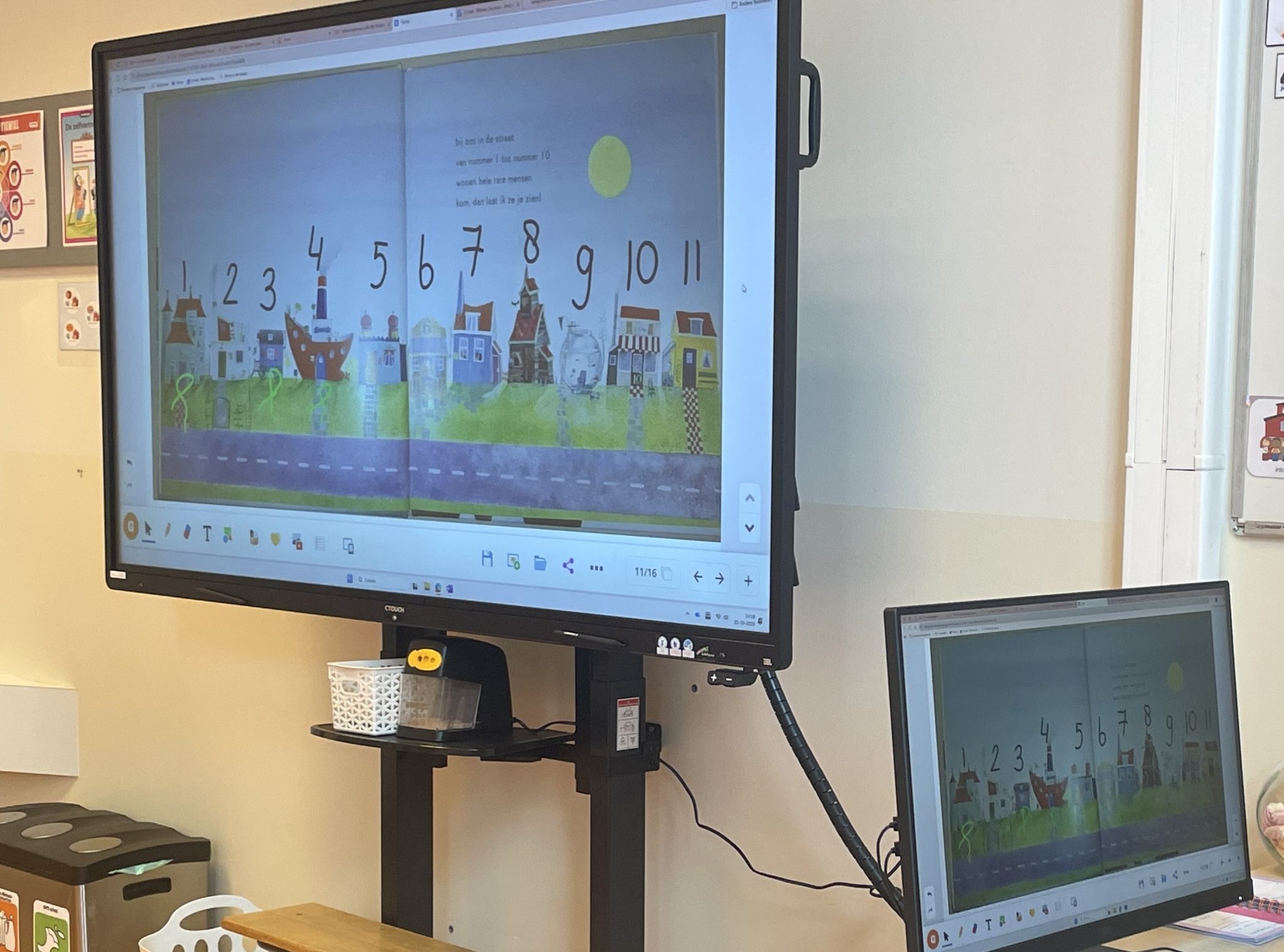 Bij de kleuters gebruik ik het digibord de hele dag door. We maken veel gebruik van Gynzy voor timers, dagritme kaarten en om iets te tekenen of op te schrijven. Daarnaast wordt er veel gezongen, gedanst en bewegend geleerd via programma’s op het digibord. Kleuters hebben af en toe een keuzeactiviteit waarbij ze een spel op het digibord mogen doen. Nu hij laag kan is dat extra leuk.