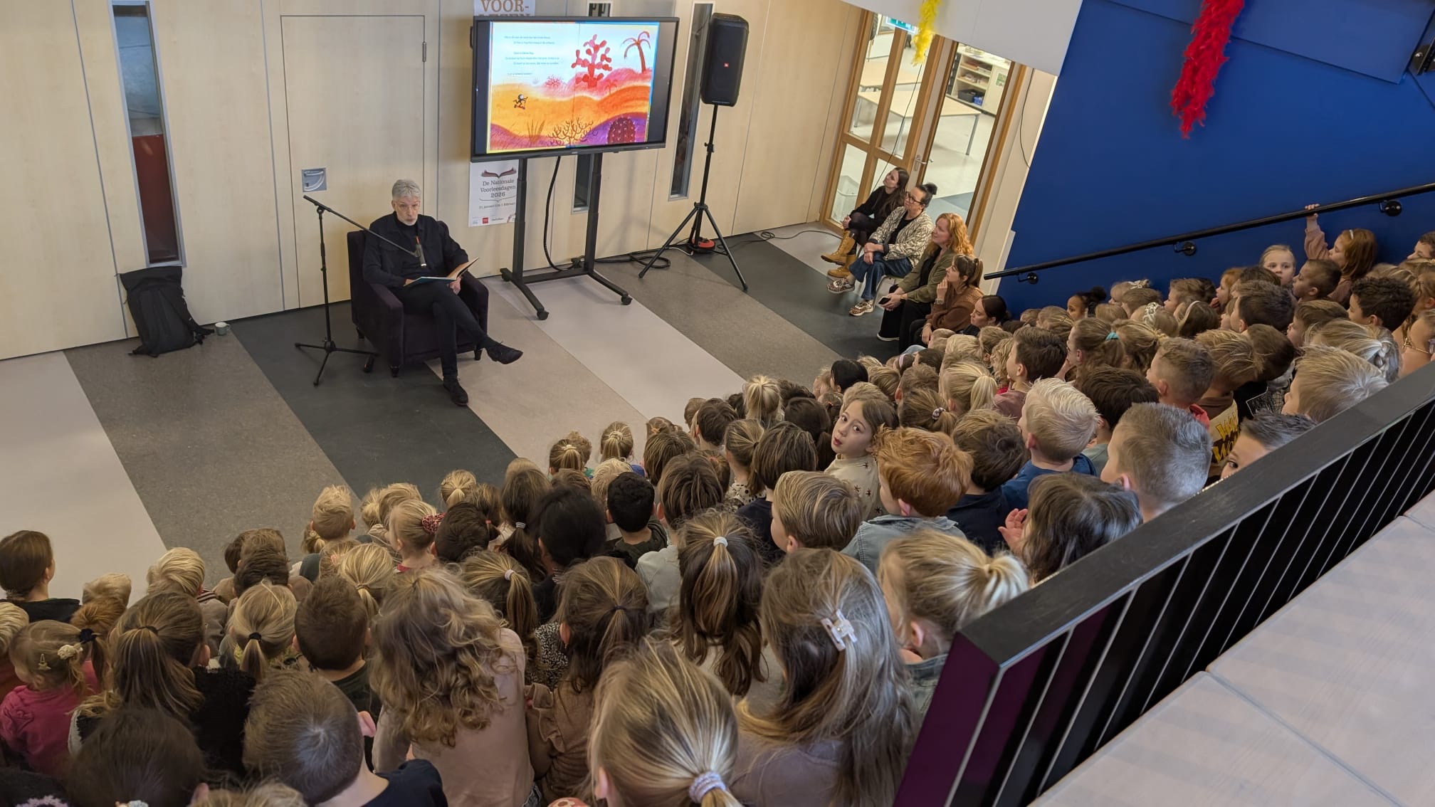 Ook onze bestuurder Paul Meessen moest er aan geloven, hij werd voor het karretje gespannen en dat ging hem goed af: geboeid voorlezen aan meer dan 150 leerlingen op basisschool Maria in Erp, het was een succes!