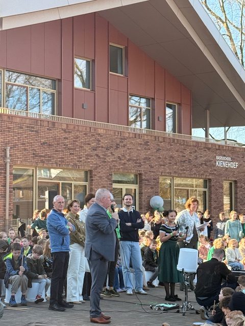 Tijdens de “balkonscene”(beide scholen hebben zowaar een balkon!) werden de verschillende, nauw betrokken partijen letterlijk in de groene spotlights gezet en bedankt voor hun grote inzet gedurende het gehele en intensieve bouwtraject!